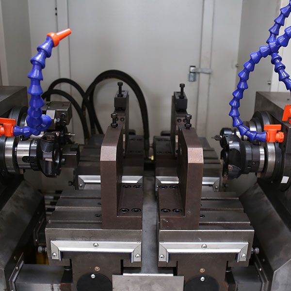 ZK8206-500铣端面打中心孔机床为平床身卧式三轴结构,采用三套数控进给工作台,两套对置的双主轴动力头,铣削主轴上装有BT50标准接口的铣刀盘,钻孔主轴上装有BT40标准的钻刀柄,钻孔主轴上还可以选装外圆套车刀盘用于钻中心孔的同时在工件轴端套车一段外圆,用于后序车床加工时夹持,可省去车床调头加工的一道工序。采用两套自定心液压虎钳,用于装夹工件,夹具可快速的根据工件长短调整夹持位置。